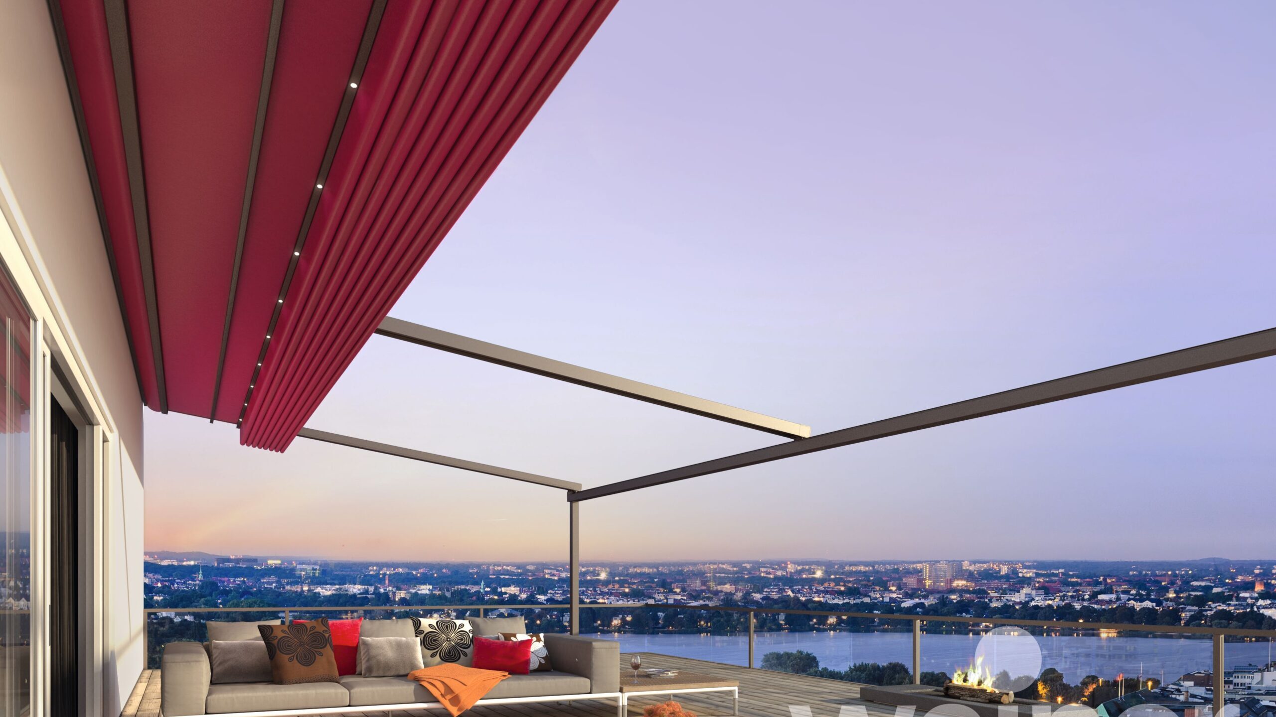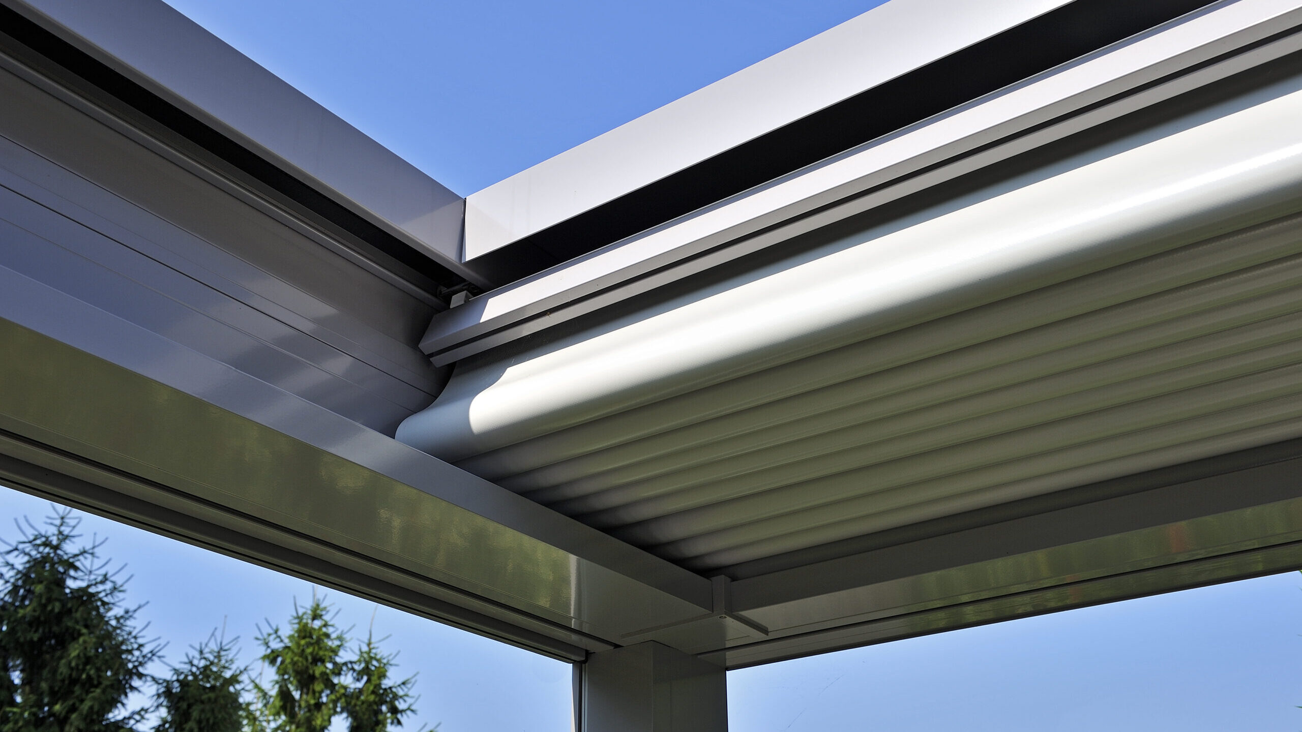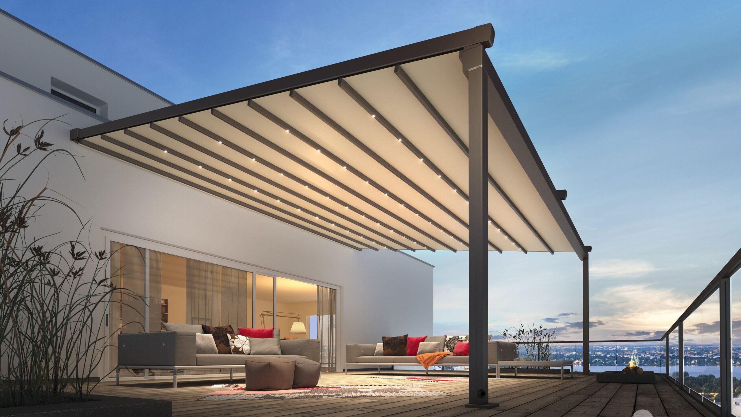 Personaliseer de pergola naar hartenlust! Dankzij de sfeervolle verlichtingsmogelijkheden wordt het ’s avonds op het terras extra gezellig. Kies voor dimbare ledverlichting in de palen, de zijgeleiders of de ondersteuningsbalk. Een volautomatische, oprolbare volant gestuurd door zonne-energie kan geïntegreerd worden en is de oplossing bij uitstek tegen laagstaande zon ’s morgens bij het ontbijt of ’s avonds bij zonsondergang.