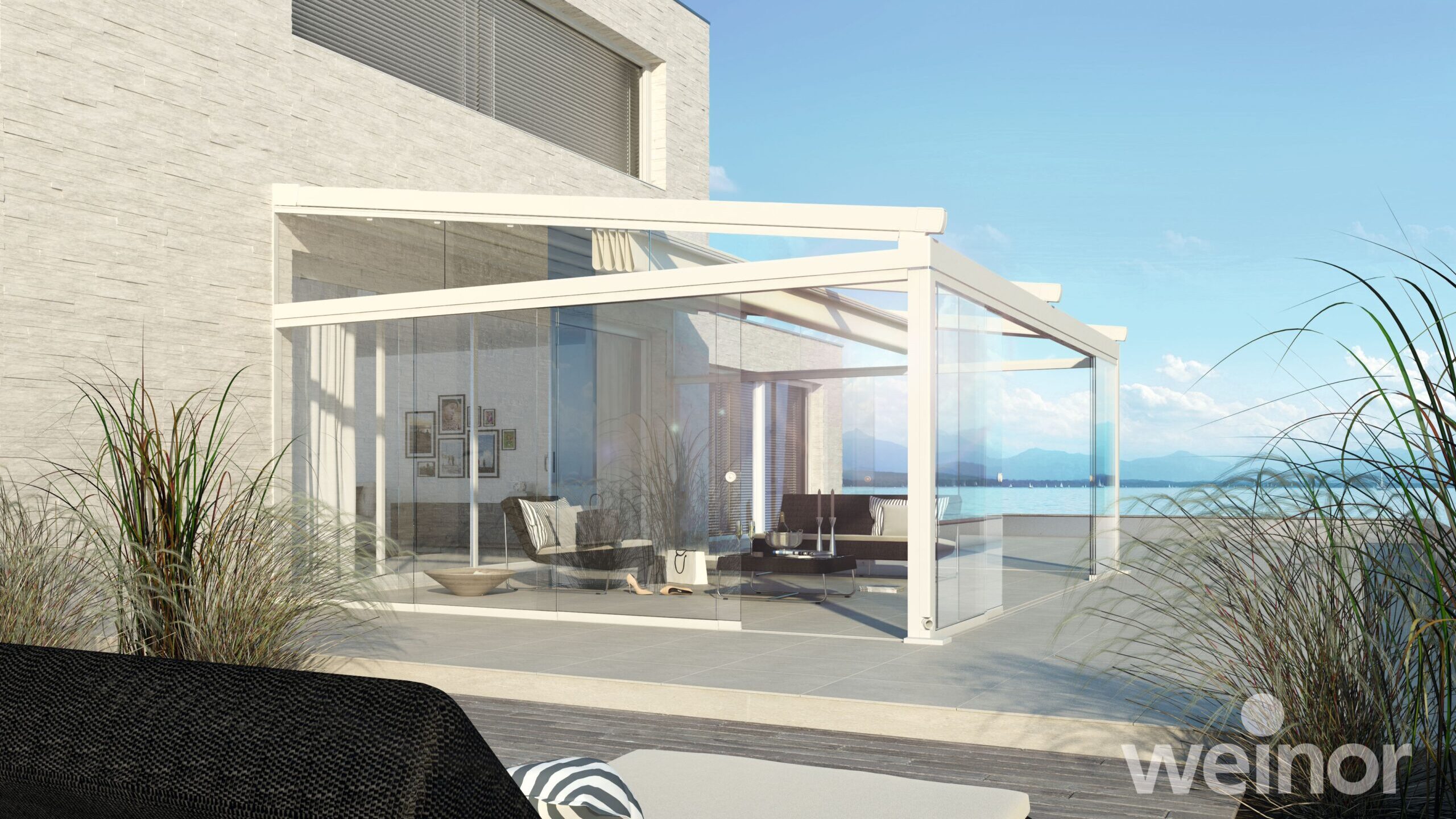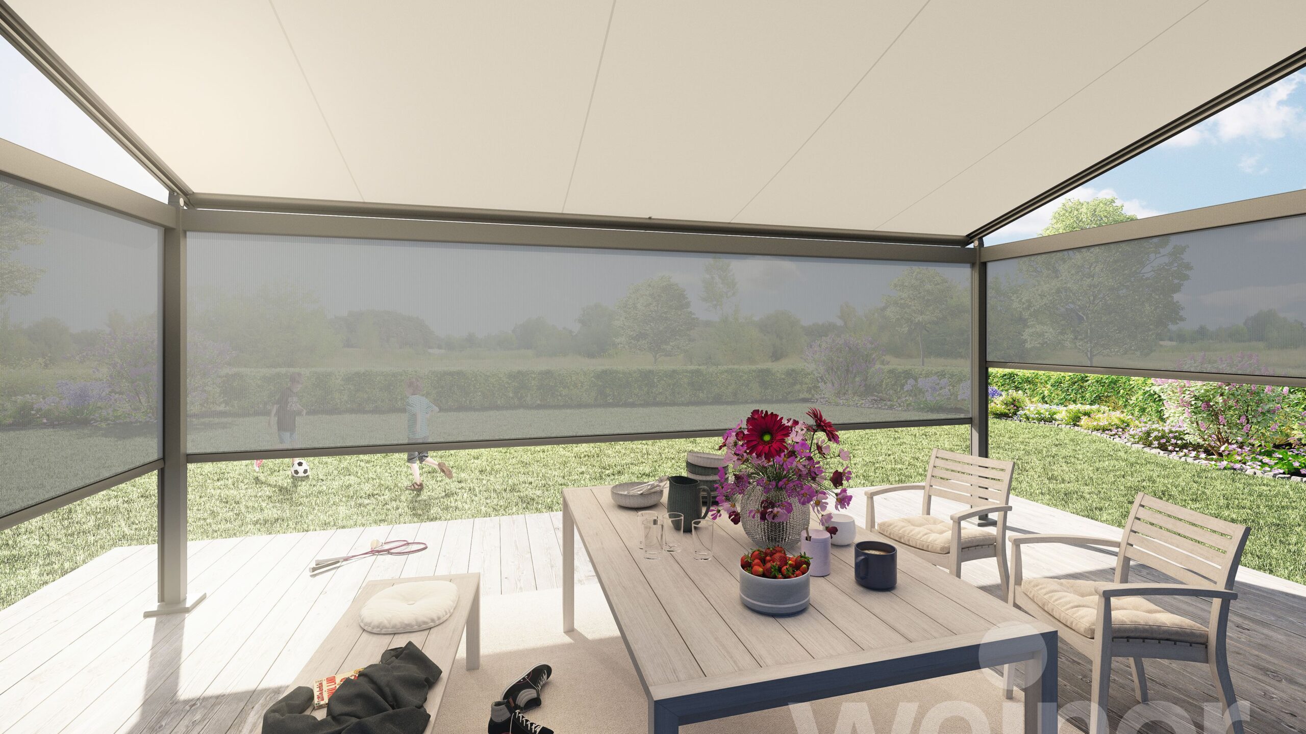 Een uitgekiend ontwerp garandeert een panoramisch zicht op de tuin en veel lichtinval in de woning. De pergolazonweringen worden aangebouwd aan de woning en combineert de voordelen van een zonnescherm met de troeven van een terrasoverkapping. Het doek wordt elektrisch opgerold dankzij de duurzame ZIP screen-technologie. Zo blijft het doek jaar na jaar strak gespannen in de geleiders. De slanke palen zorgen ervoor dat de zonwering als het ware verdwijnt in de architectuur van de woning.